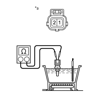 REMARQUE: En cas de vérification du capteur de température du liquide de refroidissement du moteur dans l'eau, veiller à ne pas laisser l'eau entrer en contact avec les bornes. Après la vérification, essuyer l'eau présente sur le capteur de température de liquide de refroidissement de moteur. Si le résultat n'est pas conforme aux spécifications, remplacer le capteur de température du liquide de refroidissement du moteur. |