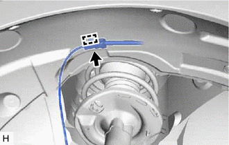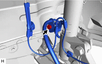 | (e) Déposer le boulon, le flexible avant et l'attache de capteur de vitesse avant du support de flexible. |