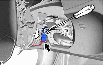 (b) A l'aide d'un tournevis dont la pointe a été préalablement entourée de ruban adhésif de protection, libérer les 2 griffes et déposer l'ensemble de contacteur d'avertissement de déverrouillage du support supérieur de colonne de direction, comme indiqué sur le schéma.