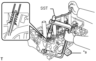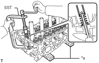 | (b) A l'aide du SST et de blocs de bois, comprimer et déposer les 2 demi-clavettes de ressort de soupape. SST: 09202-70020 09202-00010 CONSEIL: Disposer les pièces déposées dans l'ordre correct. |
