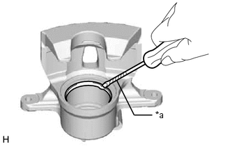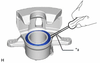 | (a) A l'aide d'un tournevis dont la pointe a été préalablement entourée de ruban adhésif de protection, déposer le joint de piston du cylindre de frein à disque avant. REMARQUE: Veiller à ne pas endommager la surface de l'intérieur, ni la rainure du joint de piston du cylindre de frein à disque avant. |