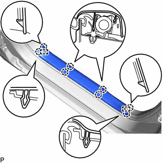 | (a) Libérer les 5 griffes et le guide pour déposer la plaque de seuil de porte arrière gauche. |