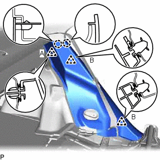 (b) Libérer les 2 griffes et les 2 agrafes (B), puis déposer le garnissage latéral de siège arrière gauche.