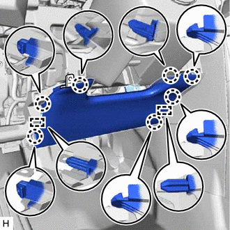 | (d) Libérer les 7 griffes et les 2 guides pour détacher l'ensemble d'airbag de tableau de bord inférieur n° 1. REMARQUE: Lors de la dépose de l'ensemble d'airbag de tableau de bord inférieur n° 1, ne pas tirer sur le faisceau de câbles de l'airbag. |