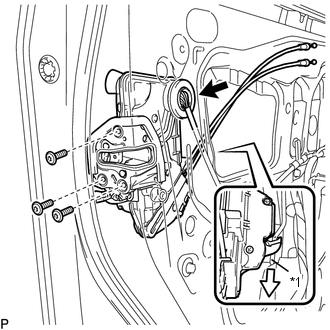 | (1) Déposer le joint du faisceau de câble de serrure de porte de l'ensemble de serrure de porte avant avec moteur. |