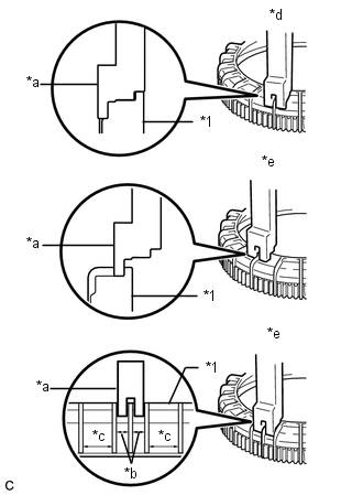 | (2) Régler la position du SST (griffe) de sorte que l'orifice dans le SST (plaque) pour l'installation du SST (poignée) se situe au centre du dispositif de retenue de jauge de pompe à carburant. |