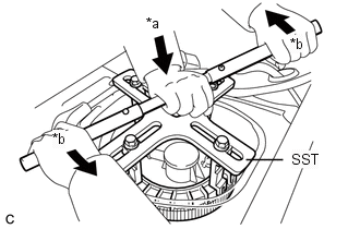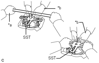 | (c) Tout en maintenant le centre du SST (poignée) pour empêcher le SST de se détacher du dispositif de retenue de jauge de pompe à carburant, le tirer vers le SST (poignée), et pendant qu'une autre personne tire sur l'autre extrémité du SST (poignée), desserrer lentement le dispositif de retenue de jauge de pompe à carburant d'environ 90°. SST: 09808-14030 09808-01010 09808-01020 09808-01030 09808-01050 SST: 09808-01071 REMARQUE: