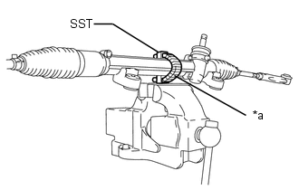| (b) Poser le SST sur le sous-ensemble d'embout de barre d'accouplement gauche. SST: 09960-20010 09961-02060 REMARQUE: S'assurer que les extrémités de la partie supérieure de l'ensemble gauche de barre d'accouplement et du SST sont alignées. |