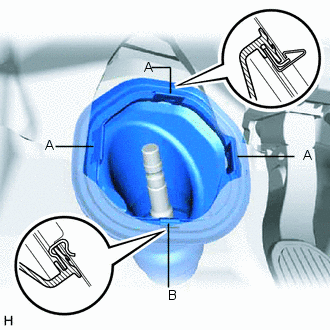 | (a) Déposer les 3 agrafes (A), libérer l'agrafe (B) de la carrosserie puis détacher le sous-ensemble de cache d'orifice de colonne de direction n° 1. REMARQUE: Veiller à ne pas endommager les agrafes (A) et (B). |