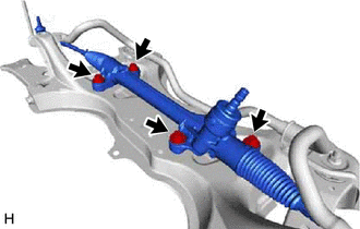 | (a) Déposer les 4 boulons et l'ensemble de tringlerie de direction du sous-ensemble de traverse de suspension avant. |