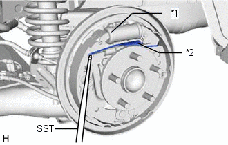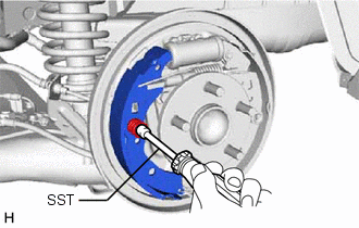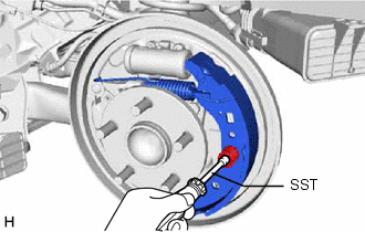 | (a) A l'aide du SST, détacher le ressort de tension de la mâchoire de frein (avant). SST: 09921-00011 REMARQUE: Ne pas endommager le soufflet de cylindre de roue. |