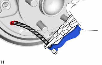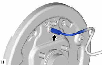 | (a) A l'aide d'une clé à écrou de raccord, débrancher la canalisation de frein de l'ensemble de cylindre de roue de frein arrière. |