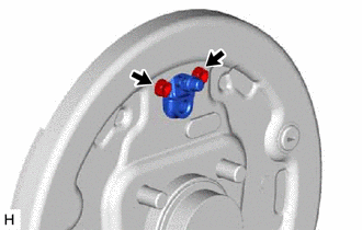 | (b) Déposer les 2 boulons et l'ensemble de cylindre de frein de roue arrière de la plaque de soutien. |