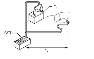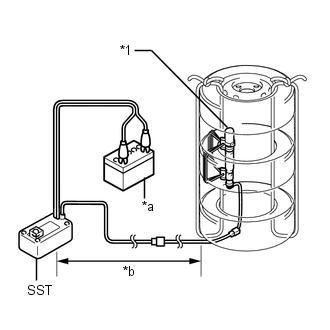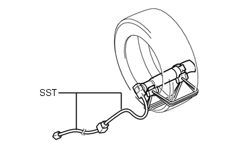 | (1) Brancher le connecteur SST. SST: 09082-00700 REMARQUE: Pour éviter d'endommager le connecteur ou le faisceau de câbles du SST, ne pas enclencher le verrouillage secondaire du double verrouillage. De même, laisser du mou au faisceau de câbles du SST à l'intérieur du pneu. |