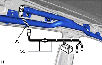 | (1) Après avoir raccordé l'un à l'autre les SST suivants, les brancher sur l'ensemble d'airbag rideau. SST: 09082-00700 SST: 09082-00802 09082-10801 09082-20801 REMARQUE: Pour éviter d'endommager le connecteur ou le faisceau de câbles du SST, ne pas enclencher le verrouillage secondaire du double verrouillage. |