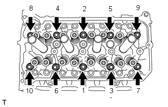 | (d) Etape 1: (1) A l'aide d'une clé à douze pans de 10 mm, reposer et serrer uniformément et en plusieurs étapes les 10 boulons de réglage de culasse en suivant l'ordre indiqué sur le schéma. Torque: 49 N·m {500 kgf·cm, 36 ft·lbf} REMARQUE: Veiller à ne pas laisser tomber les rondelles plates dans le sous-ensemble de culasse. |