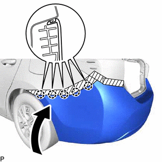| (b) Engager les 5 griffes comme indiqué sur le schéma pour reposer l'ensemble de pare-chocs arrière. CONSEIL: Procéder de la même façon pour le côté droit et pour le côté gauche. |