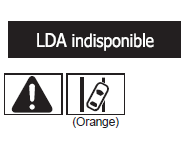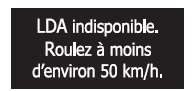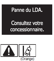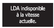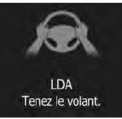 caméra. Un signal sonore se déclenche également. → Désactivez le système LDA (alerte de sortie de voie avec commande de direction) et suivez les procédures de dépannage appropriées pour le message d'avertissement. Conduisez ensuite le véhicule un court instant, puis activez à nouveau le système LDA (alerte de sortie de voie avec commande de direction). |