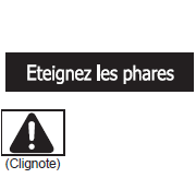 Un signal sonore se déclenche également. → Éteignez les éclairages. Véhicules avec système d'accès et de démarrage mains libres: Indique que le contact du moteur est mis sur arrêt ou en mode ACCESSORY et que la porte conducteur est ouverte alors que les phares sont allumés. Un signal sonore se déclenche également. → Éteignez les éclairages. |